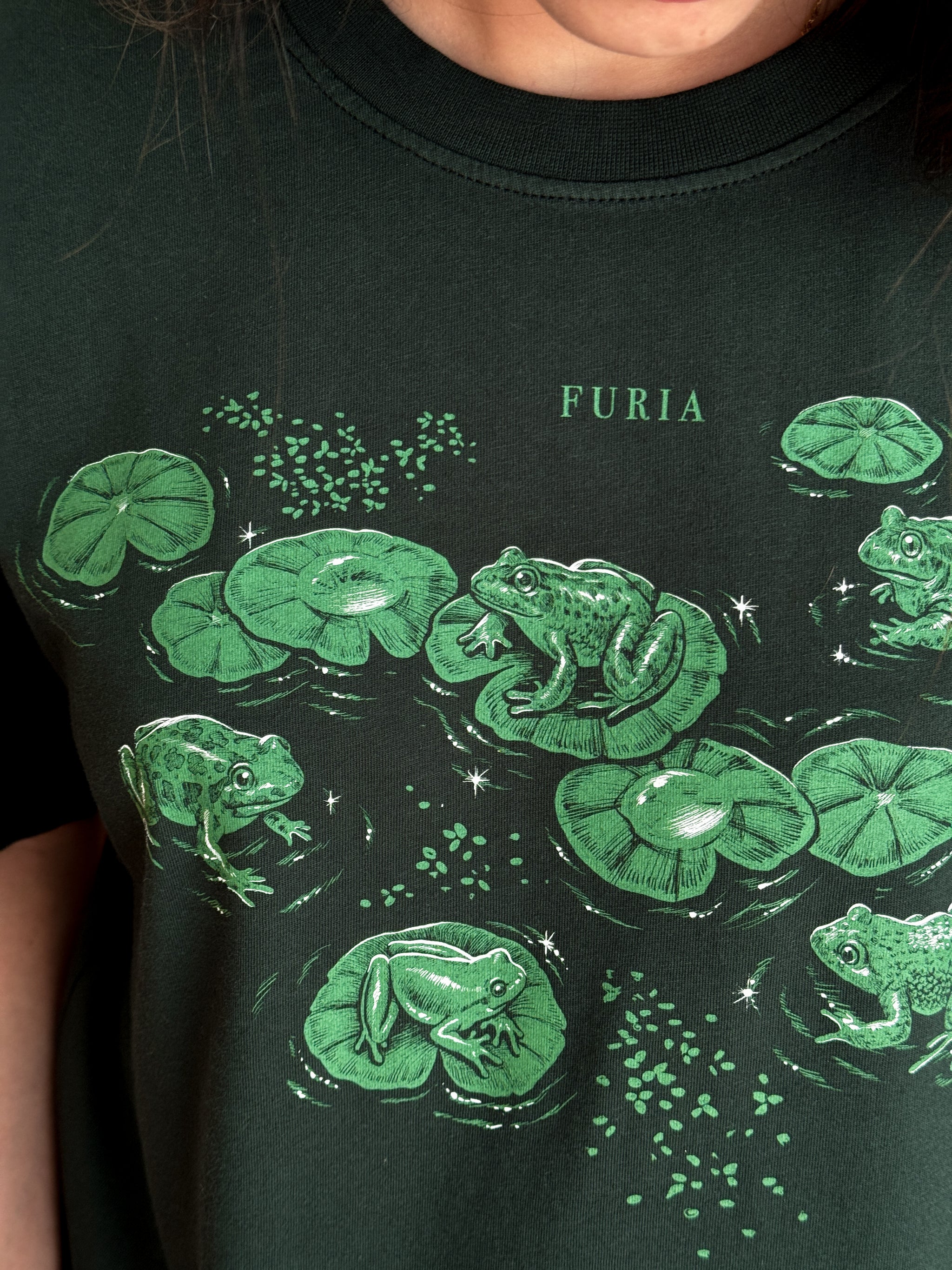 Scientific illustration design of frogs and toads from the Iberian Peninsula in two colors, green and white, on a dark green background. On the front, we have represented the frogs in their habitat on some water lilies in a pond, and on the back, they are drawn in different poses, like in an illustration from an old biology book. 🐸